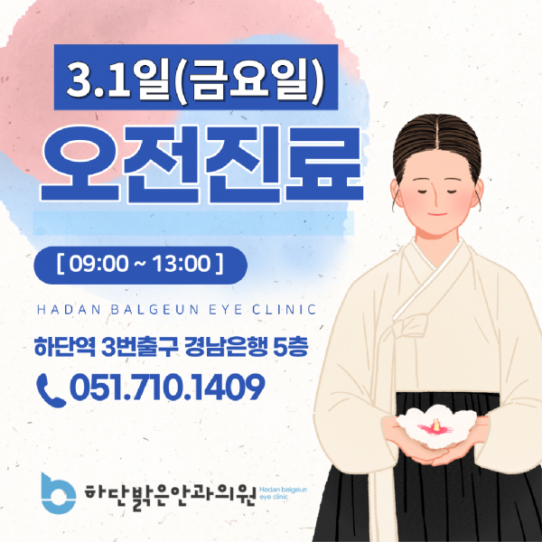 3.1일 진료안내드립니다. 페이지 정보 작성자 하단밝은안과 댓글 0건 조회 808회 작성일 24-02-17 09:19 목록 본문 하단밝은안과는3/1일 삼일절 (금) 오전진료입니다. 참고하시어 예약 및 내원에 불편없으시길 바랍니다.눈이 불편하시다면하단역 3번출구경남은행 5층을 찾아주세요. 댓글 0 댓글목록 등록된 댓글이 없습니다.